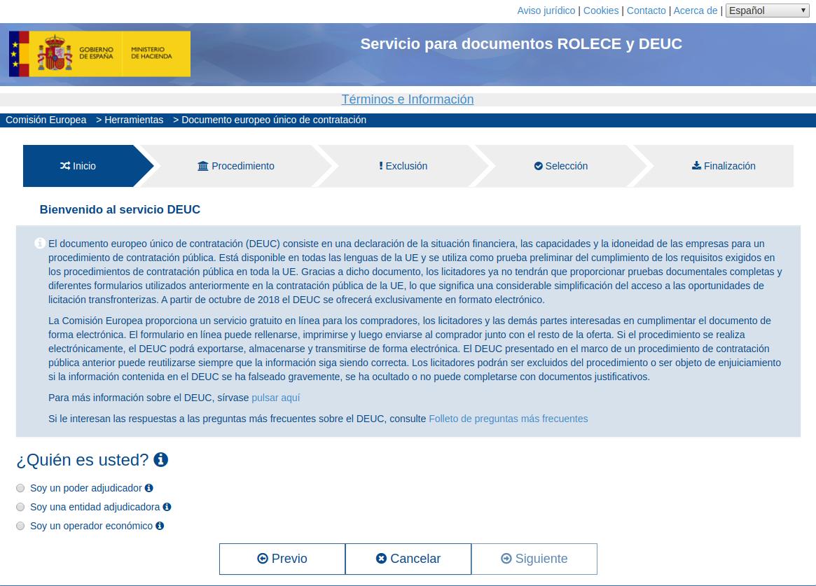 Para cumplimentar el DEUC debes acceder al siguiente enlace: https://visor.registrodelicitadores.gob.es/espd-web/filter?lang=es